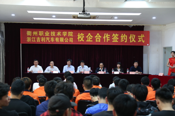 学校领导、企业代表与订单班学员合影本次校企合作签约是机电工程学院与浙江吉利汽车有限公司在经过长期接触、彼此充分了解的基础上,由校外实习基地的建立再到深度人才培养合作迈出的可喜一步-----成立吉利订单班。签约仪式开始后,陈青为仪式致辞,他强调了我校重新独立办学以来一贯坚持的两个办学理念,一是坚持“俯身贴地,提升能力,服务衢州地方经济”的发展理念,二是坚持“工学结合、校企合作、产教融合、知行合一”的育人理念。提出校企合作双方要共同努力建成联合培养人才、共同开发课程、共建实训基地、合作技术研发等长效合作机制的希望和要求。