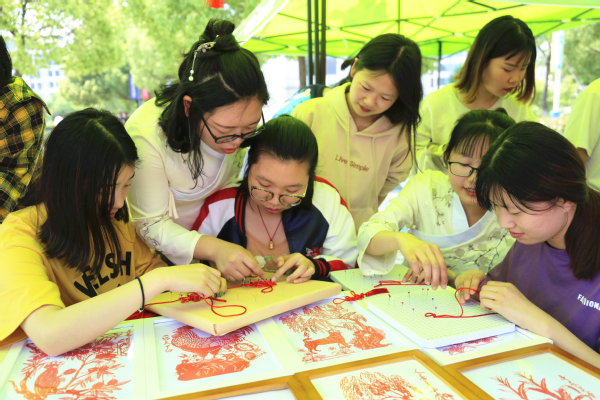 早早到场的崔戴飞等领导和参加本次活动的各社团学生们聊成一片,和汉服社的同学合照,与手工社同学交流剪纸刻纸技巧,与同学们一起猜灯谜、品古诗,学做中国结。