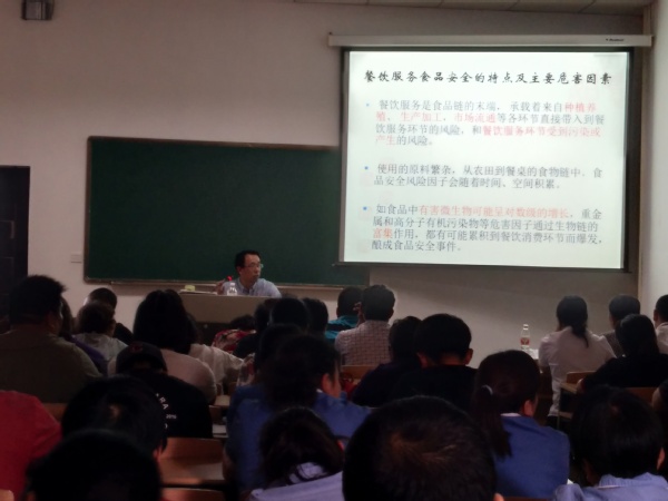 为进一步提高食堂从业人员的食品安全意识和整体素质,加强食堂从业人员管理和培训,确保我校饮食卫生安全,5月16日下午,市市场监督管理局何建新处长应邀来我校食堂开展从业人员食品安全培训,90余名食堂从业人员参加培训。