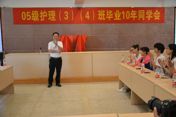 余文富代表医学院致辞,他对05级护理3、4两个班同学能在毕业十周年回母校举行同学会表示热烈欢迎。余书记从基本情况、办学声誉、办学实力、办学规模、学生教育管理等五个方面介绍了学校、医学院近年来的发展和可喜变化,并特别提到护理专业是浙江省“十二五、十三五”优势专业,护理专业学生获得了多项国家、省级荣誉。他指出,这些成就离不开校友的大力支持,他对校友们表示衷心感谢,并送上诚挚祝福,并邀请校友们常回母校看看。