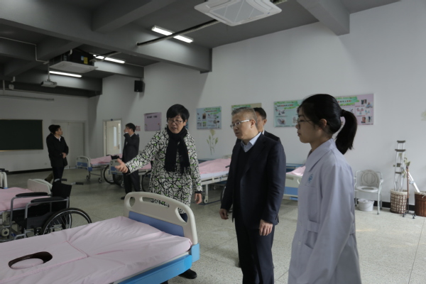 徐文光一行首先来到了我校医学实训楼,参观了护理实训基地、母婴护理实训基地、老年护理基地、中药学实训基地。在母婴护理实训室,徐书记拿起月嫂培训手册仔细观看,详细了解了月嫂的培训情况,并对我校的社会培训工作给予了充分的肯定。