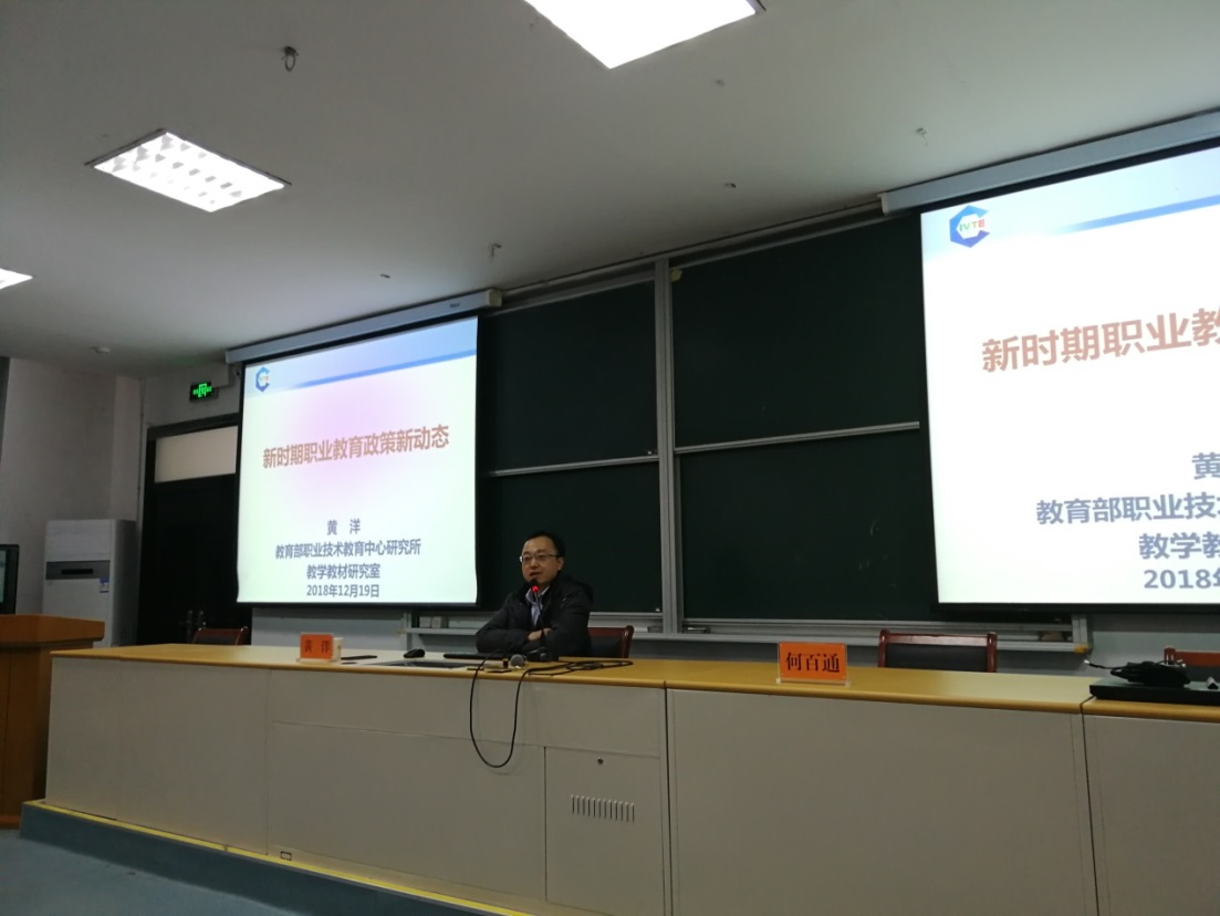 教育部职业技术教育中心研究所黄洋老师以“新时期职业教育政策新动态”为题, 分析了当今外部环境的变化以及现实问题的挑战, 解读了国家职业教育政策的新动态, 包括一个基本判断、 三个转变和四个主攻方向,并提出了对职业教育专业设置、课程设置和课堂教学的思考和展望。