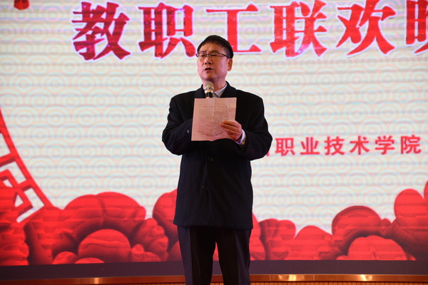 校长江爱民为晚会致辞,为全体教职员工送上新春的祝福。