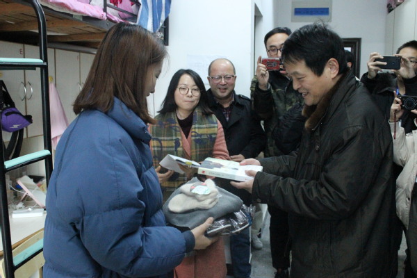 1月8日中午,校党委书记崔戴飞、党委副书记陈青以及学生处、二级学院领导、老师等一行带着学生的微心愿,化身“爱心使者”参加了爱在衢职之爱的私人订制活动,走访了学生寝室。