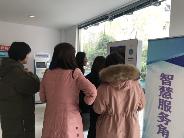 考察组首先在浙旅职学生处资助主管徐迎老师的带领下参观了学生事务中心,对“互联网+”下最多跑一次业务改革进行了现场模拟演练。