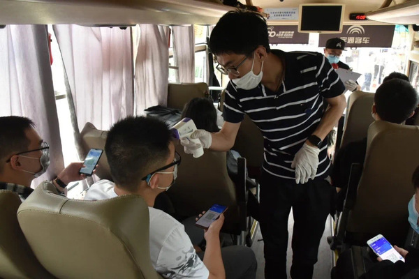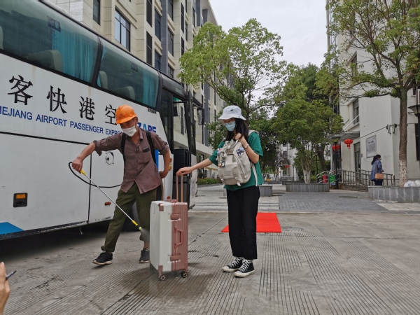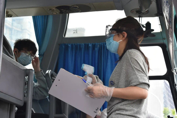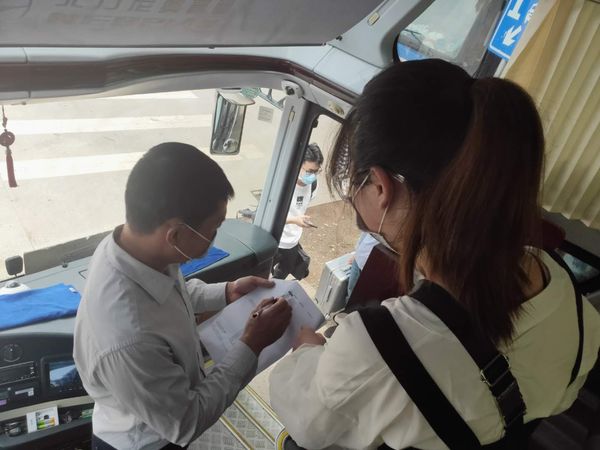 出发前,为确保学生安全,衢汽集团对车辆进行整体消毒,每辆车配备体温枪、消毒水、口罩等防疫物资,同时确保司机持有绿色健康码、十四天未到过疫情严重地区。同时,学生处要求衢汽集团在学生上车前做好学生信息确认、查看健康码、检测体温。