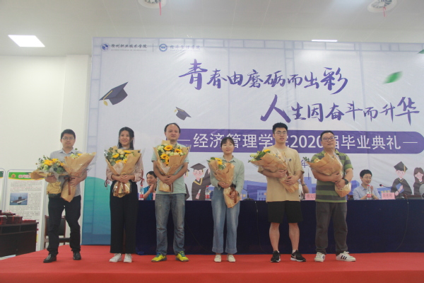 典礼在雄壮的国歌中拉开序幕。尔后,经管副院长兼党总支副书记覃龙飞宣读省级、院级优秀毕业生名单,经济管理学院副院长汪榜江教授为其颁发荣誉证书。傅元勋副校长宣读经管2020届毕业生名单,并为毕业生代表颁发毕业证书。
