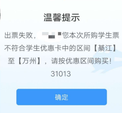 当学生买票在12306买票时提示优惠信息核验失败时(如下图3、图4所示),请学生在资质查询里仔细核查所绑定的优惠区间(如图1所示)是否是正确的站点名称,若发现绑定站点不正确或与实际乘车区间(学校--家庭)不符时,请尽快找教务处226吕菲老师修改优惠卡内站名名称,然后去车站自助机刷身份证、优惠卡重新绑定资质信息,重新绑定资质以后12306上资质信息区间修改成功后才可以买票!