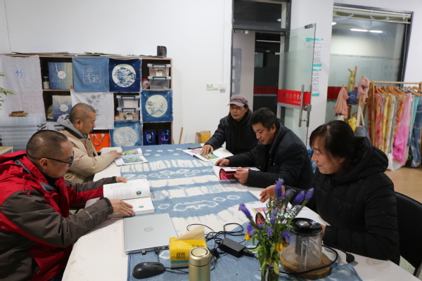 邱兴雄来到环境艺术工作室,仔细查看学生正在进行的毕业设计作品,翻看毕业设计画册,并询问创作思路、表现技巧等,就学生设计过程中遇到的困惑予以指导交流。郑军德就扎染工作室的建设与发展,文创产品的研发,以及余东农民画的发展等交换意见。