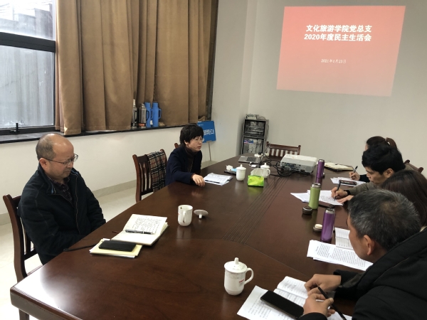 会议汇报了上一年度民主生活会整改措施落实情况。郭大勇代表文化旅游学院党总支作了2020年度自查报告,他从夯实基层党组织,紧抓党员队伍建设;强化组织领导,健全工作机制;严格组织生活,增强活动效果;思想教育有作为,发挥党员先锋模范作用;抓学风建设,不断深化立德树人工作;提炼总结,谋划党建品牌思路等六个方面对文化旅游学院党总支2020年度工作进行了总结,同时深入分析了产生问题的原因,并提出了今后的努力方向和整改措施。随后,班子成员依次作个人检视剖析,逐一开展批评与自我批评。大家在发言中坚持开门见山、开诚布公、严肃认真地提出意见建议,帮助改进提高,进一步统一思想、明确方向、凝聚力量。