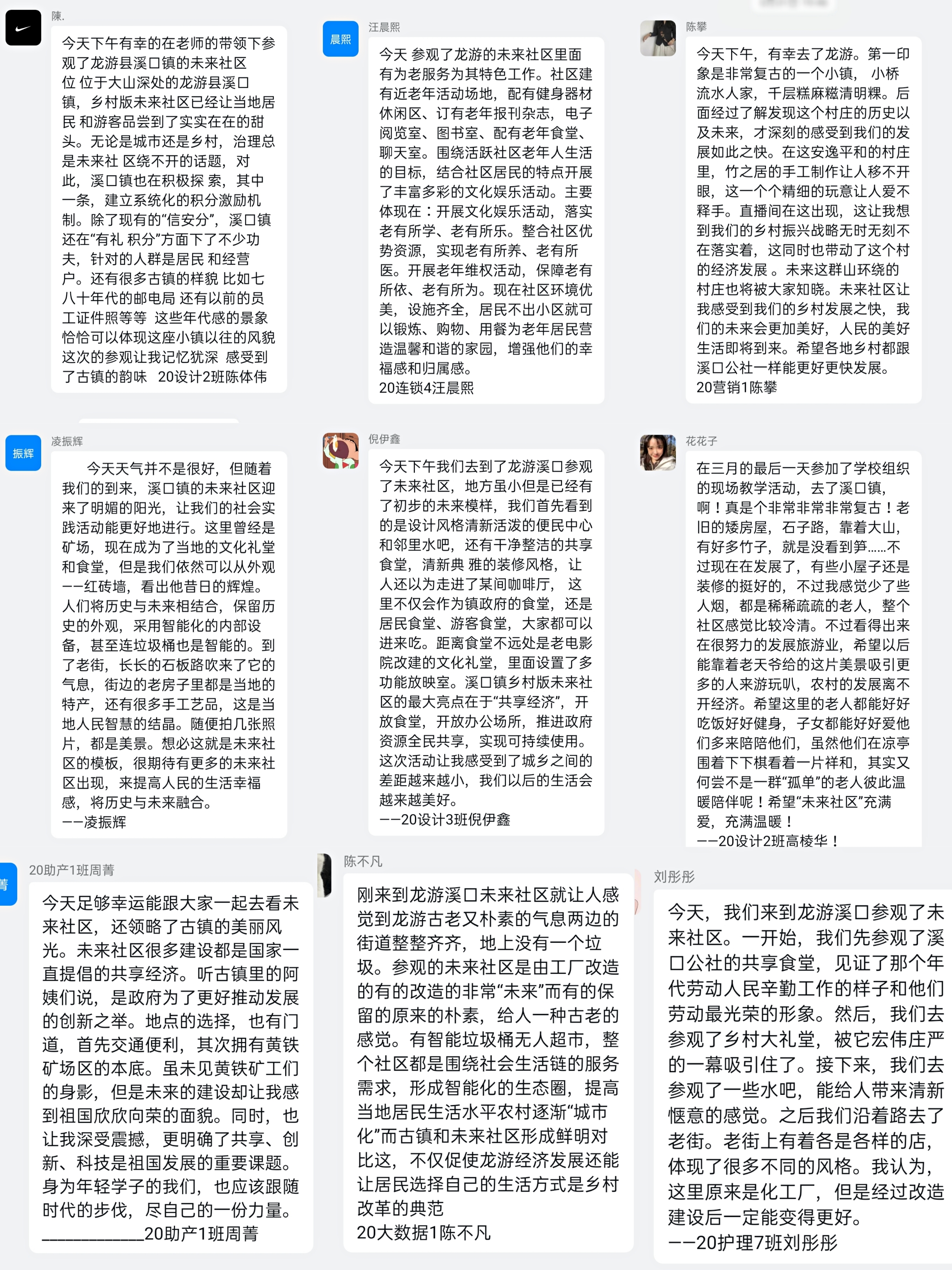 同学们饶有兴致地参观了龙游县溪口镇未来社区。溪口镇未来社区是由始建于1959年有着60余年历史的黄铁矿职工生活区改造而来。通过教师的讲解同学们了解了溪口镇未来社区的建设历史和以美好生活为目标追求、以美丽宜居为环境底色、以智慧互联为基本特征、以绿色低碳为核心理念、以创新创业为时代风尚、以和睦共治为治理方式的未来社区建设愿景。在参观共享食堂、乡村礼堂、众创公社、共享图书馆、创客花园时,同学们惊叹于于现代设计的植入为乡村振兴注入的新动能;大家对既具有现代化气息又兼顾乡土文化的未来社区建设感触颇多。现场教学活动结束后,同学们积极分享了自己参观学习的收获与体会。
