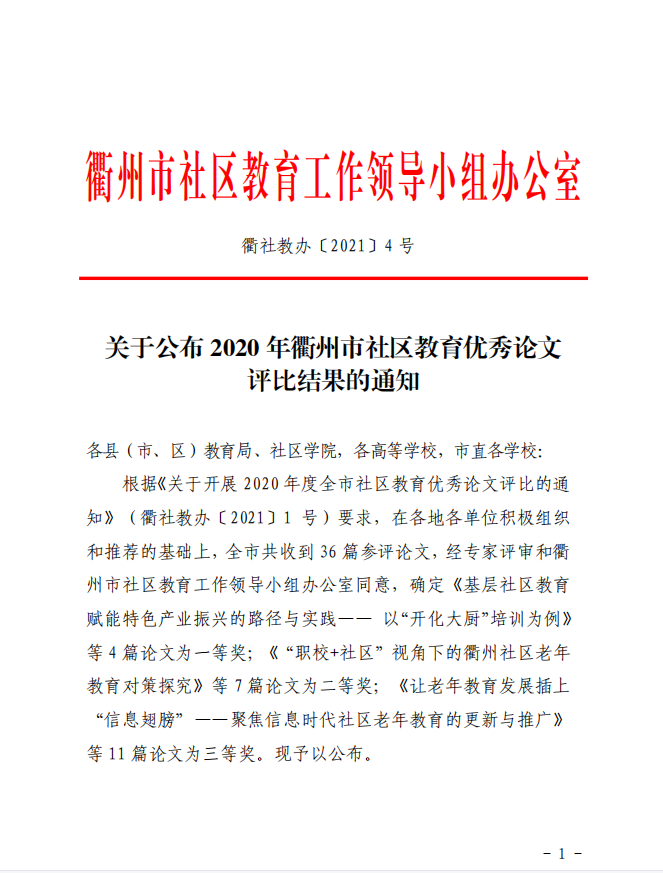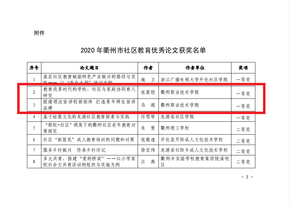 近日,从衢州市社区教育工作领导小组办公室传来好消息,我校张晨恺老师撰写的《教育改革时代的学校、社区与家庭协同育人研究》和马超老师撰写的《搭建理论宣讲创新矩阵 打造青年师生宣讲品牌》荣获2020年衢州市社区教育优秀论文一等奖。