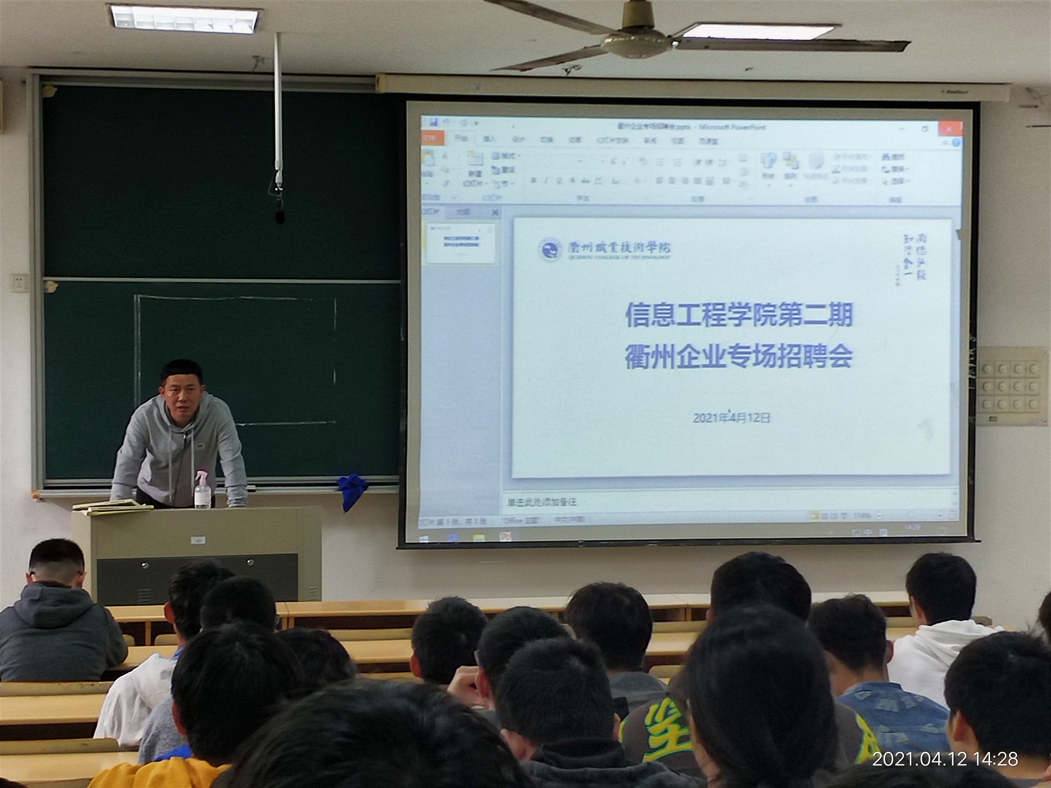 为进一步保障学生就业,服务地方经济发展,4月12日下午,信息工程学院在阶西2-1举办衢州企业专场招聘会,主要面向专升本学生。学院依托数智产业学院,重点推荐东南数字经济发展研究院、浙江信安数智科技有限公司、浙江中巨智能科技有限公司、华友钴业、金瑞泓科技(衢州)有限公司等5家衢州龙头企业。人才需求覆盖信息工程学院所有专业,提供的岗位种类多样。此次专场招聘会,通过宣讲、投简历、面试等双选流程,62名学生与企业初步达成双选意向。