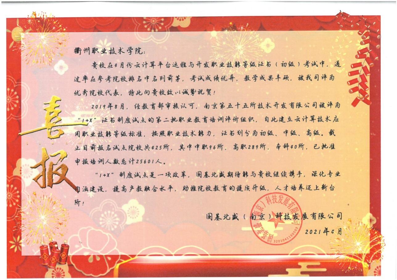 2021年4月24日,由信息工程学院组织实施的云计算平台运维与开发“1+X”职业技能等级认证考试成功举办。参加本次考试的主要有2019级计算机应用技术专业和2019级计算机网络技术专业的学生,通过率达到了85.71%,比去年全国平均通过率提高了约25%。此次考生取得的优异的成绩,展现出了学校良好的教学效果,我校被南京第五十五所技术有限公司推选为优秀院校代表。