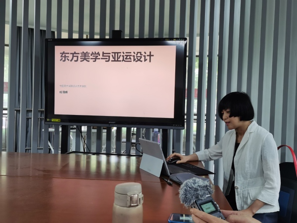 成朝晖教授以“东方美学”的视角,结合历届奥运会、亚运会的主题设计,对杭州亚运会设计的相关内容展开了深入浅出的探讨与分享。讲座过程中,成朝晖教授结合亲身设计经历,以大量的图片、影像资料,分享了亚运主题设计的东方诗意,以及“从文到图”诠释的整个完整过程。亚运核心图形其主题是“润泽”,正所谓“温润细腻”为“润”,“挥洒灵动”为“泽”, 作为杭州东方诗意的亚运灵魂,核心图形与色彩系统将“意象、意境、境界”之美心心相融。