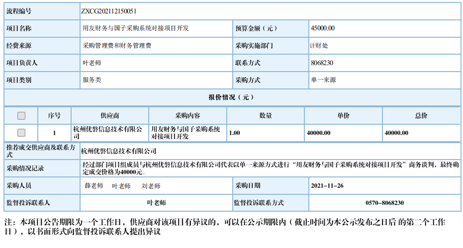 衢州职业技术学院用友财务与国子采购系统对接项目开发自行采购信息公示