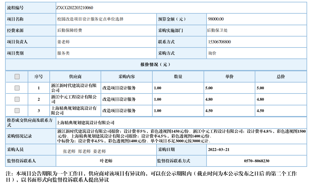 衢州职业技术学院校园改造项目设计服务定点单位自行采购信息公示