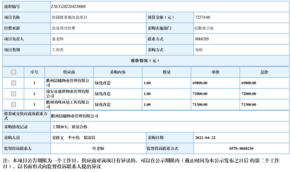 衢州职业技术学院校园微景观改造项目自行采购信息公示