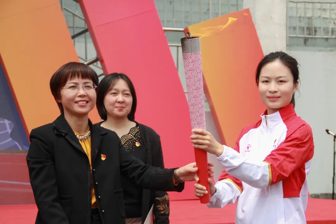 薪火相传,接续奋斗!校党委委员、副校长徐浪静将火炬传递给青春领跑人代表郑胜燕。