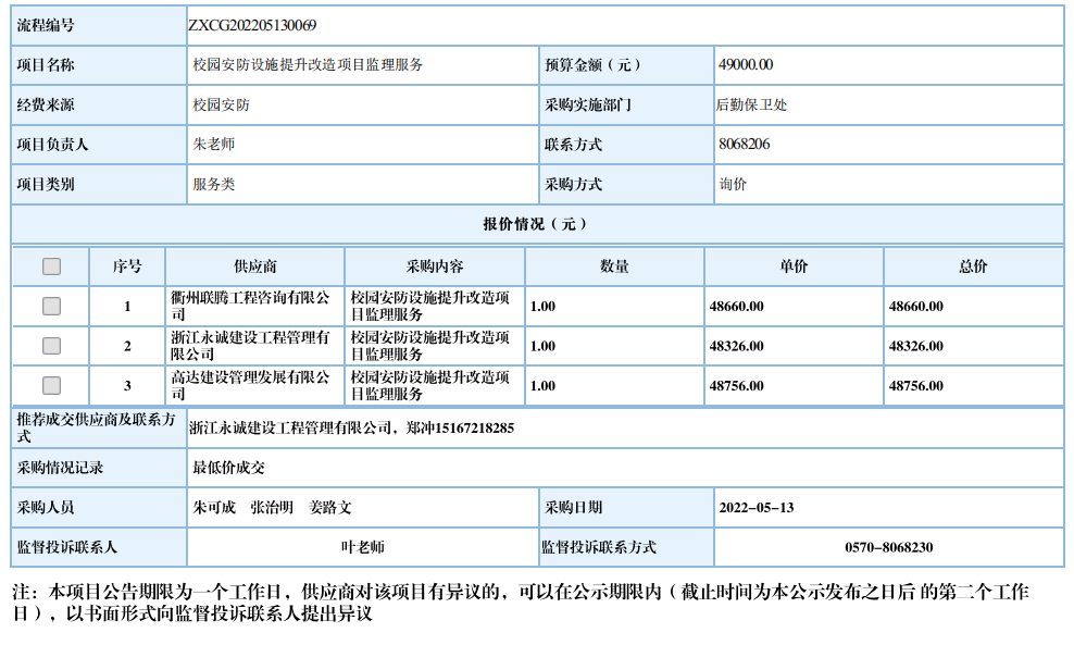 衢州职业技术学院校园安防设施提升改造项目监理服务自行采购信息公示