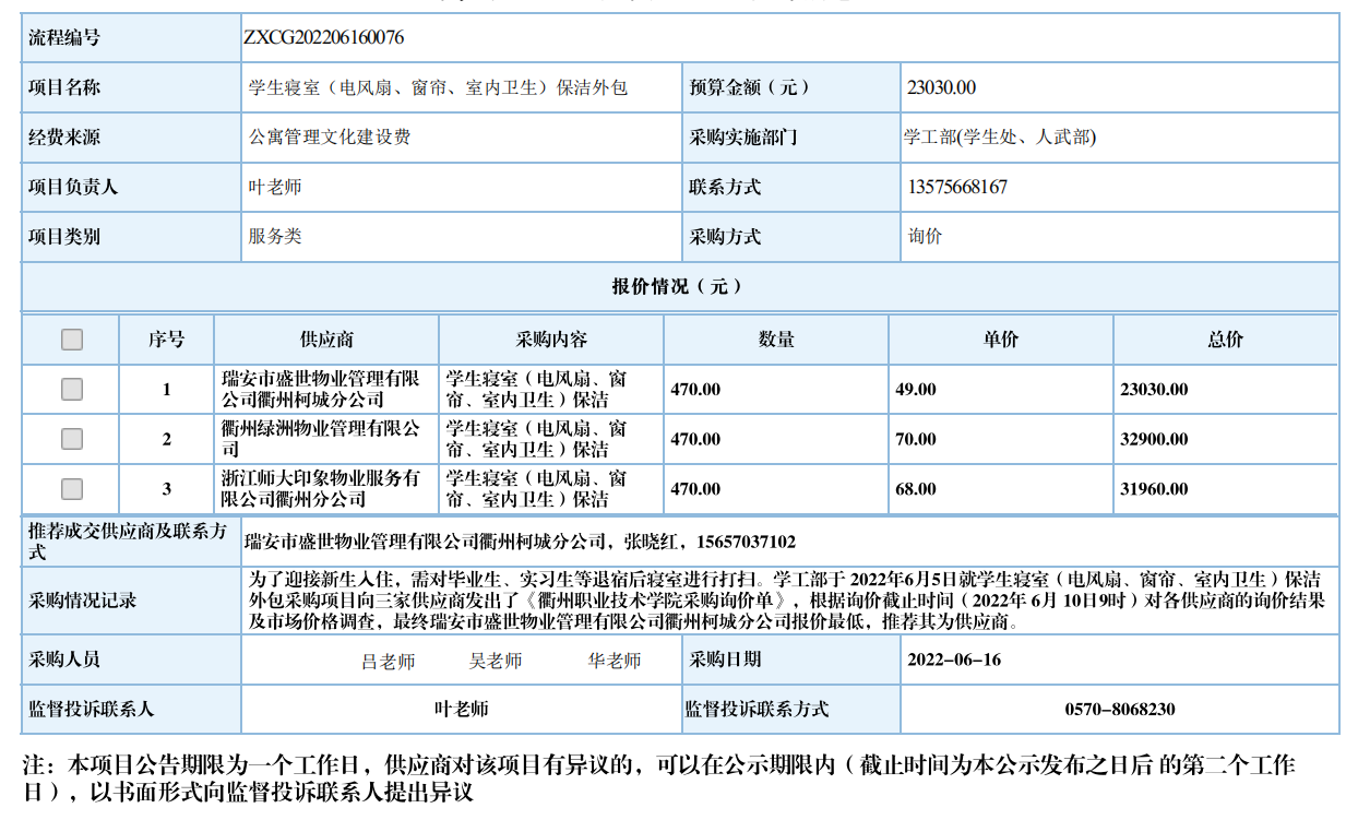 衢州职业技术学院学生公寓(电风扇、窗帘、室内卫生)保洁外包自行采购信息公示