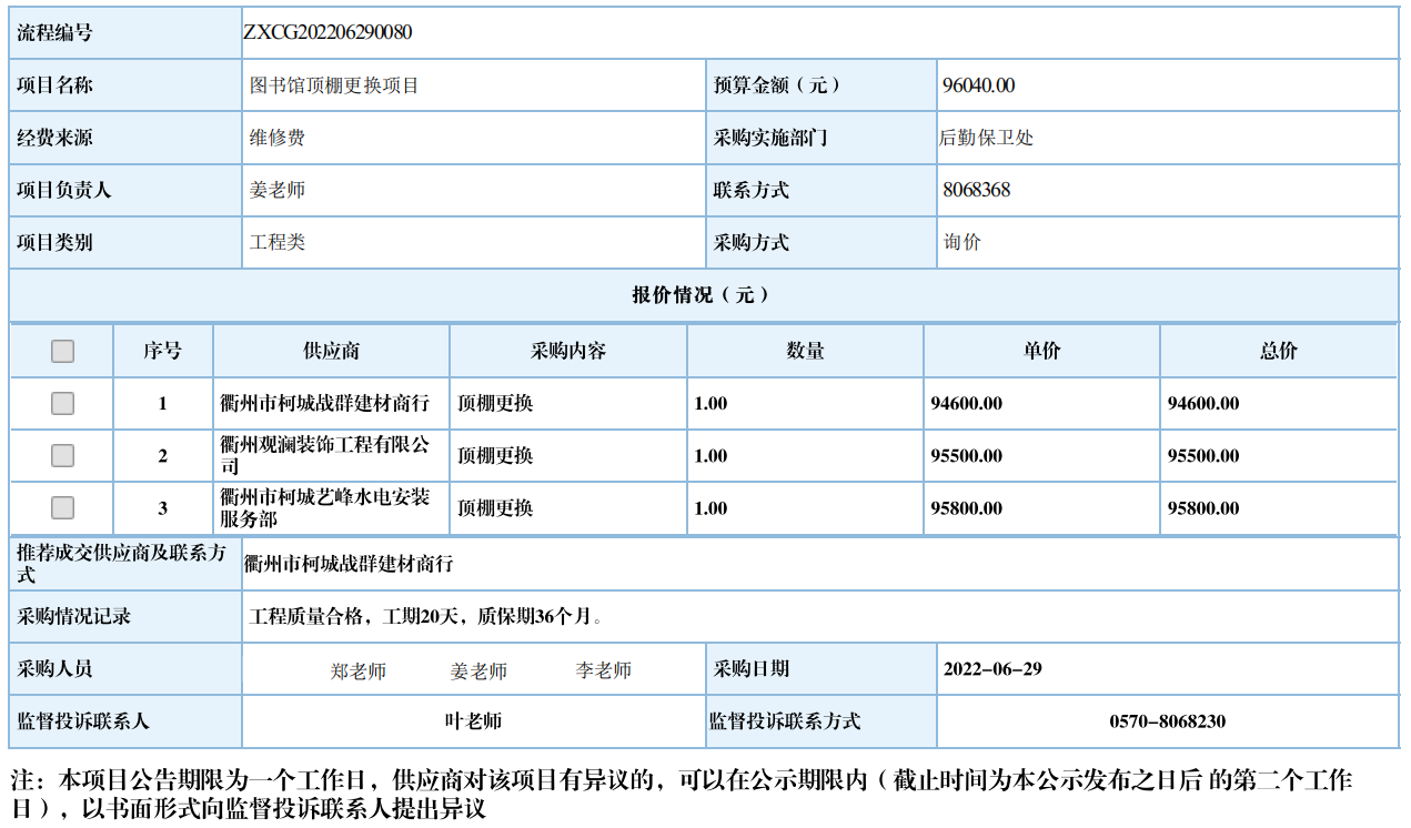 衢州职业技术学院图书馆顶棚更换项目自行采购信息公示