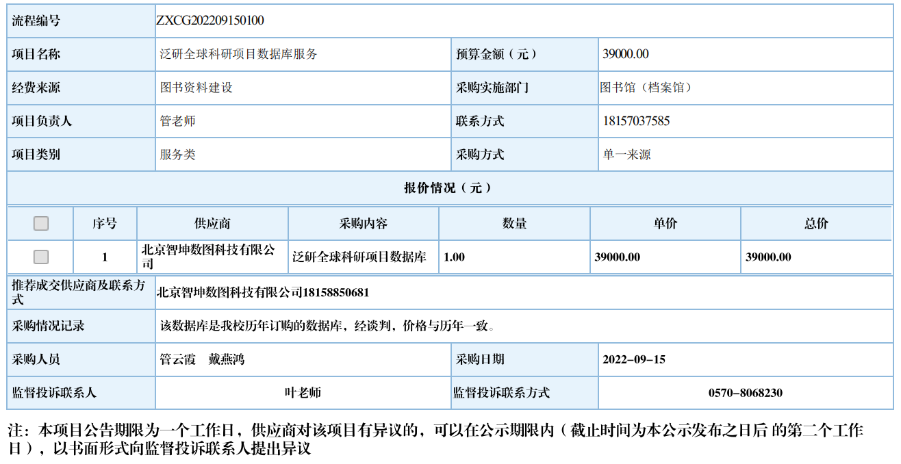 衢州职业技术学院泛研全球科研项目数据库服务自行采购信息公示