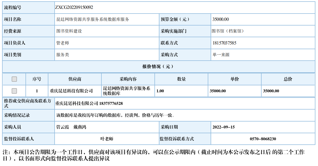衢州职业技术学院昆廷网络资源共享服务系统数据库服务自行采购信息公示