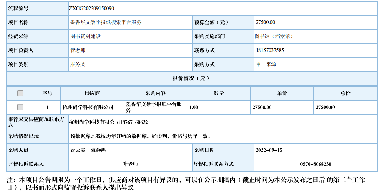 衢州职业技术学院墨香华文数字报纸搜索平台服务自行采购信息公示