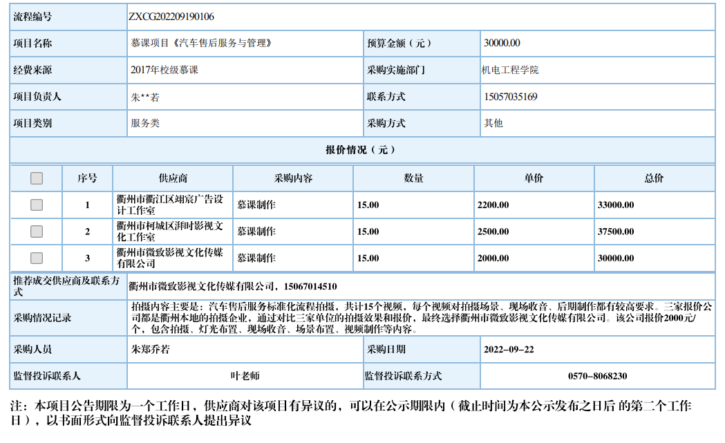衢州职业技术学院慕课项目《汽车售后服务与管理》自行采购信息公示