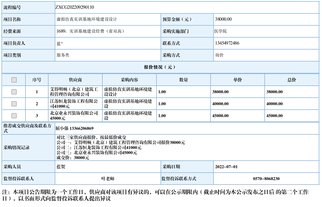 衢州职业技术学院虚拟仿真实训基地环境建设设计自行采购信息公示