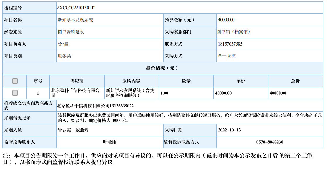 衢州职业技术学院新知学术发现系统自行采购信息公示