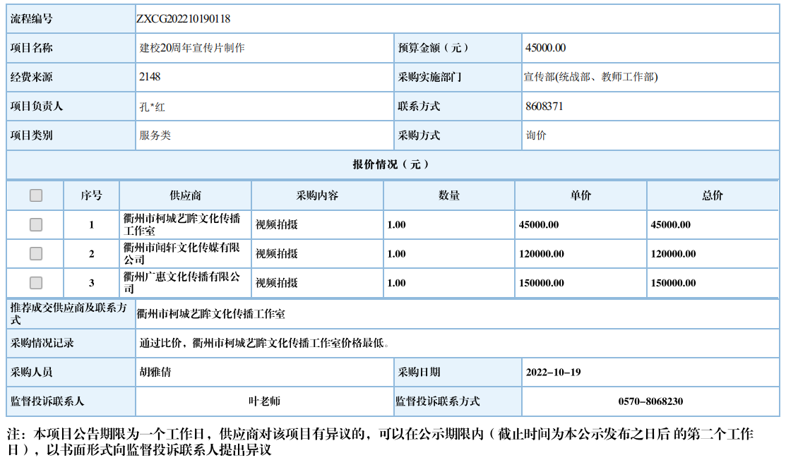 衢州职业技术学院习建校20周年宣传片制作自行采购信息公示