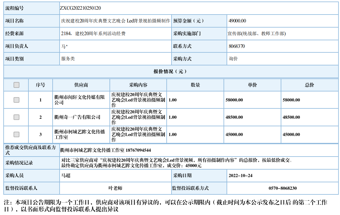 衢州职业技术学院庆祝建校20周年庆典暨文艺晚会 Led背景视频拍摄制作自行采购信息公示
