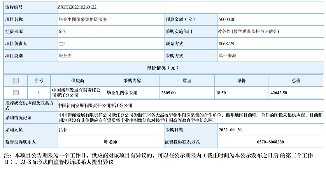 衢州职业技术学院毕业生图像采集拍摄服务自行采购信息公示