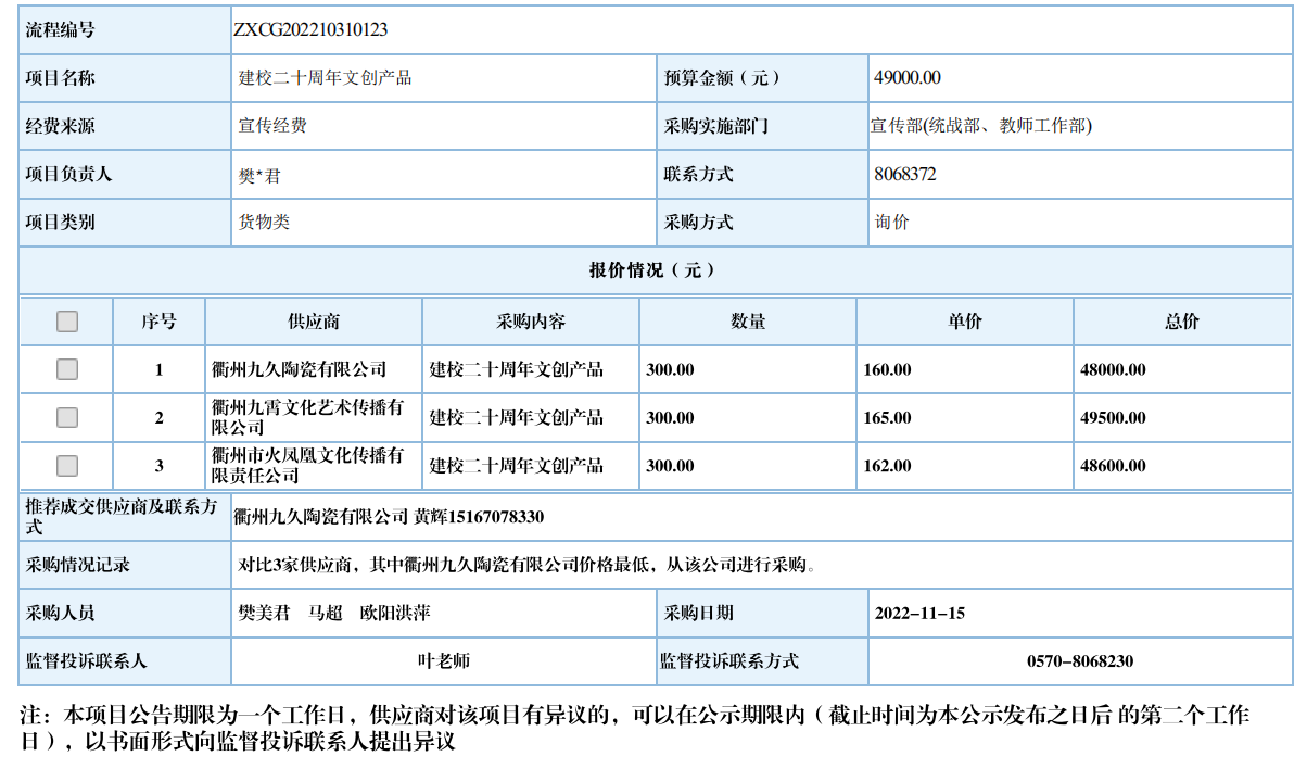 衢州职业技术学院建校二十周年文创产品自行采购信息公示