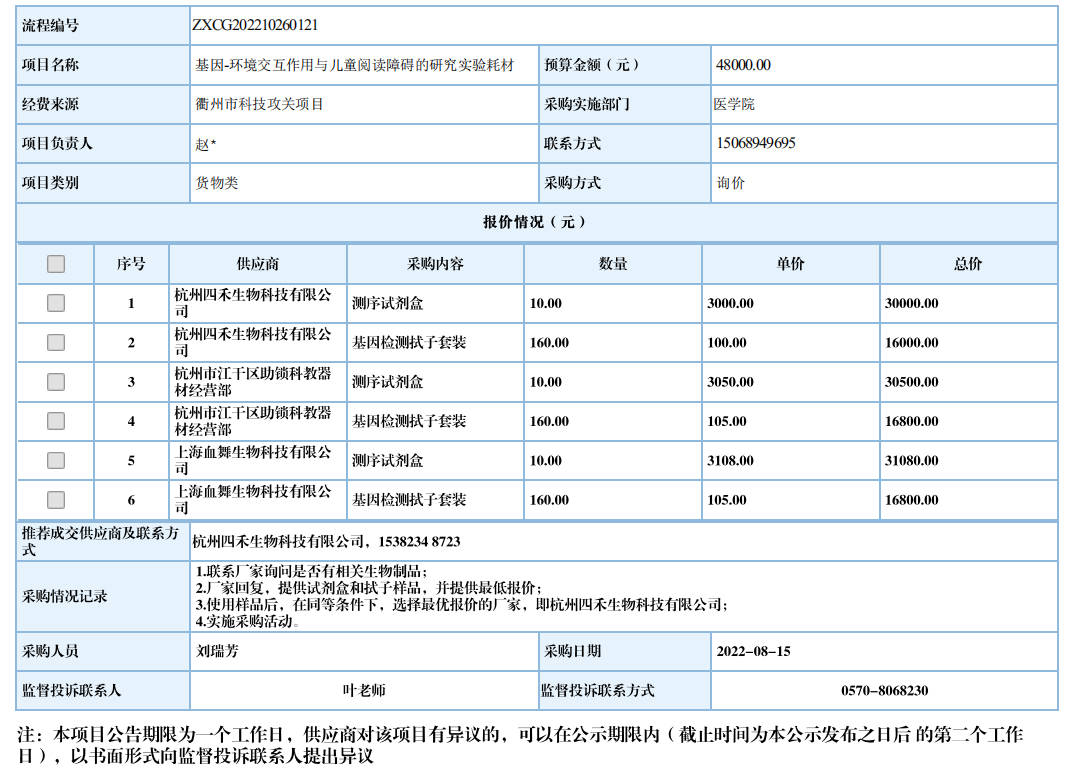 衢州职业技术学院习基因-环境交互作用与儿童阅读障碍的研究实验耗材自行采购信息公示