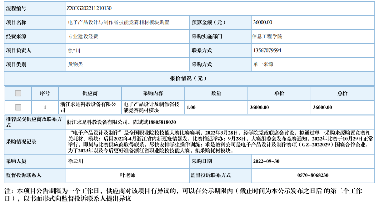 衢州职业技术学院电子产品设计与制作省技能竞赛耗材模块购置自行采购信息公示