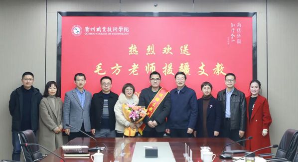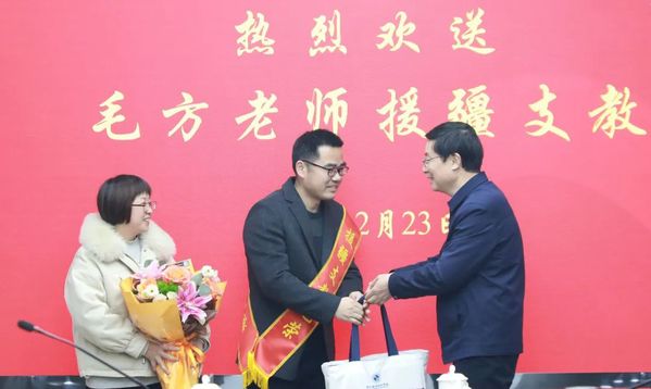 2月23日下午,我校召开毛方老师援疆欢送会。校党委书记徐须实,党委委员、副校长徐浪静出席,党委委员、副校长姚水洪主持。
