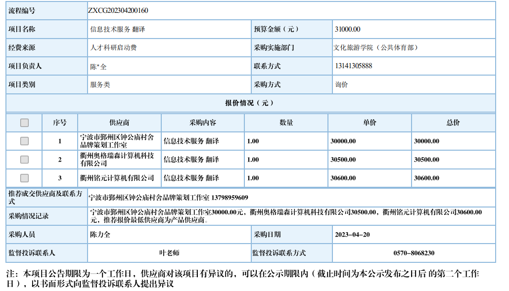 衢州职业技术学院信息技术服务翻译自行采购信息公示