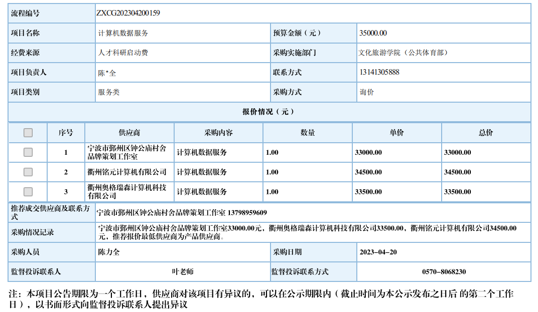 衢州职业技术学院计算机数据服务自行采购信息公示