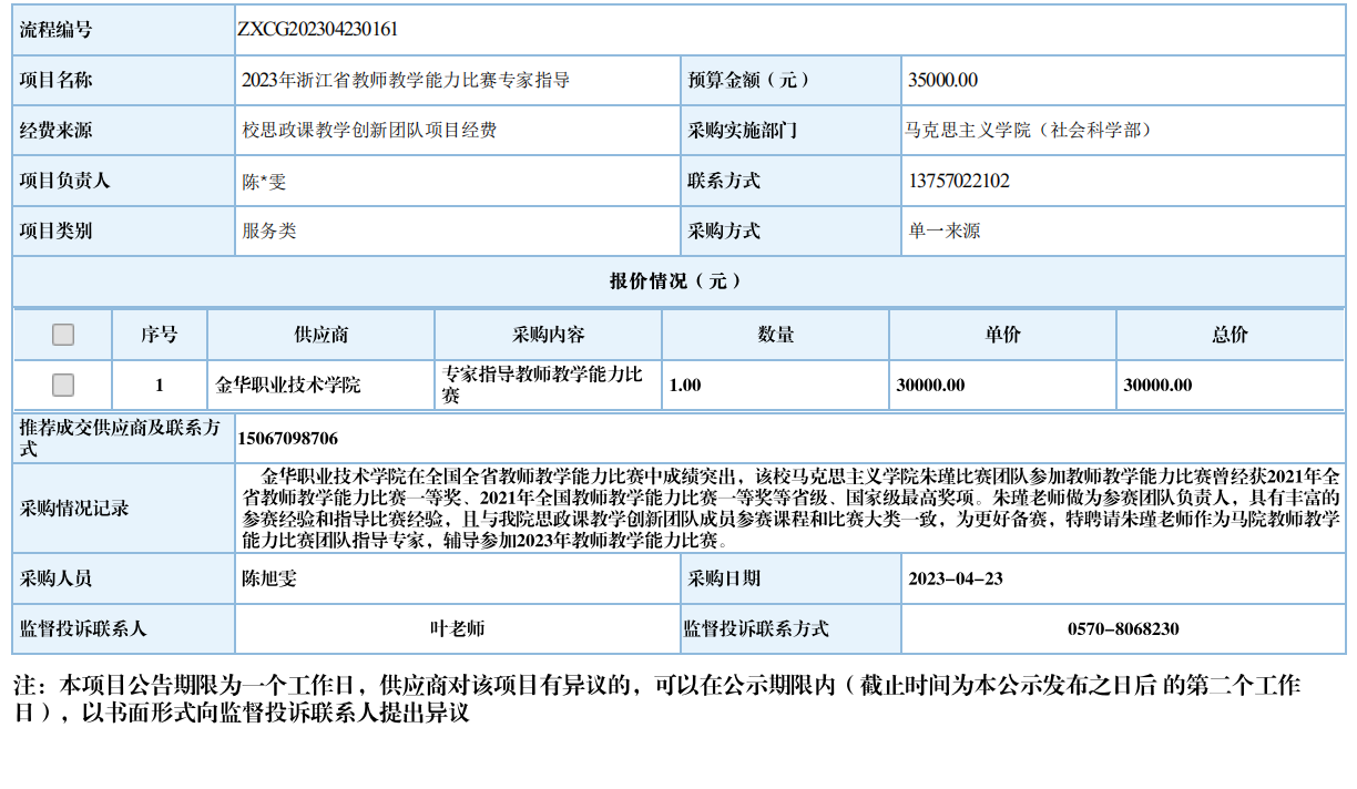 衢州职业技术学院2023年浙江省教师教学能力比赛专家指导自行采购信息公示