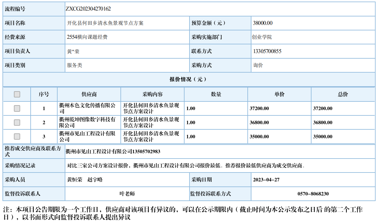 衢州职业技术学院开化县何田乡清水鱼景观节点方案自行采购信息公示