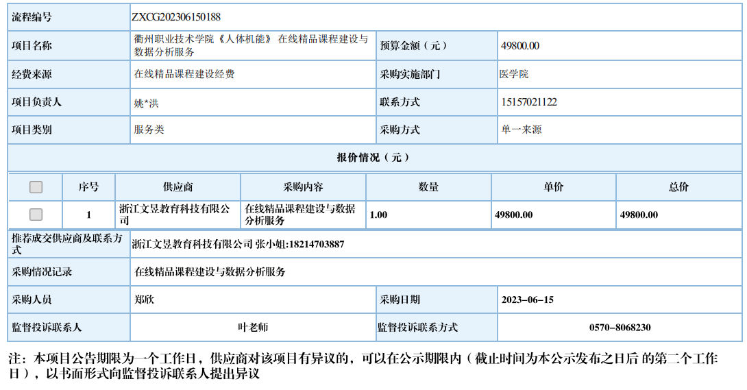 衢州职业技术学院《人体机能》在线精品课程建设与数据分析服务自行采购信息公示