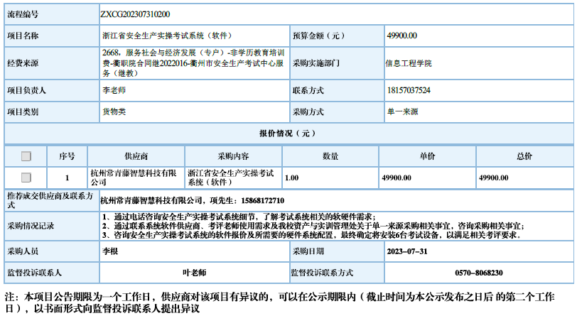 衢州职业技术学院浙江省安全生产实操考试系统(软件)自行采购信息公示