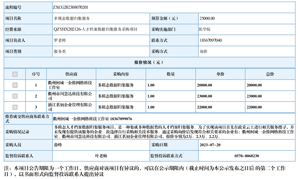 衢州职业技术学院多模态数据归集服务自行采购信息公示