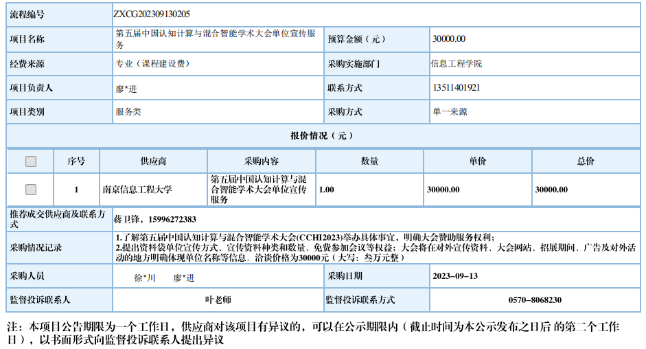 衢州职业技术学院第五届中国认知计算与混合智能学术大会单位宣传服务自行采购信息公示