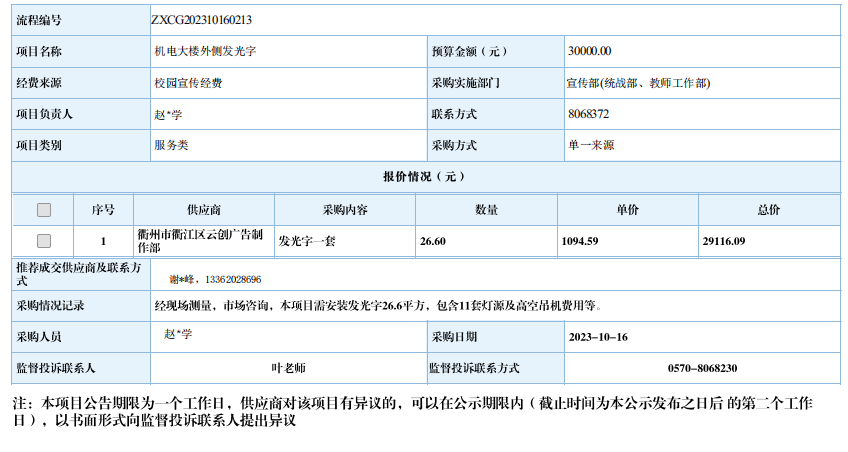 衢州职业技术学院机电大楼外侧发光字自行采购信息公示