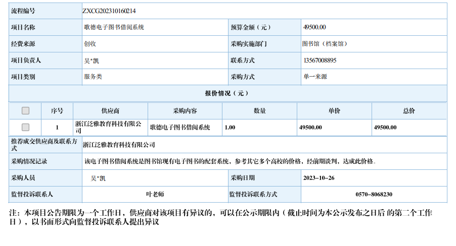 衢州职业技术学院歌德电子图书借阅系统自行采购信息公示