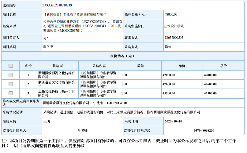 衢州职业技术学院《新闻摄影》专业教学资源课程拍摄与制作自行采购信息公示